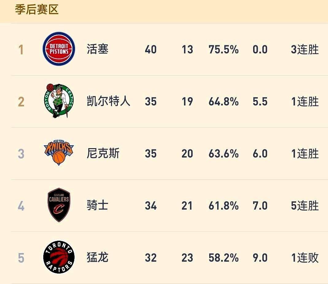 赛程,这张在NBA漫长赛季中时常被球迷忽略的表格,正在2025-26赛季的东部上演着现实版的“蝴蝶效应”。 当底特律活塞队以超过70%的胜率一骑绝尘,稳稳占据东部头把交椅时,他们身后的世界却陷入了前所未有的混乱与焦灼。 波士顿凯尔特人、纽约尼克斯与克利夫兰骑士三支球队,胜场差咬得如此之紧,以至于任何一场常规赛的胜负,都可能像推倒第一张多米诺骨牌,引发排名序列的瞬间重组。 这种“谁喘口气都可能被甩下去”的紧绷感,定义了本赛季东部“群雄逐鹿”的基调。