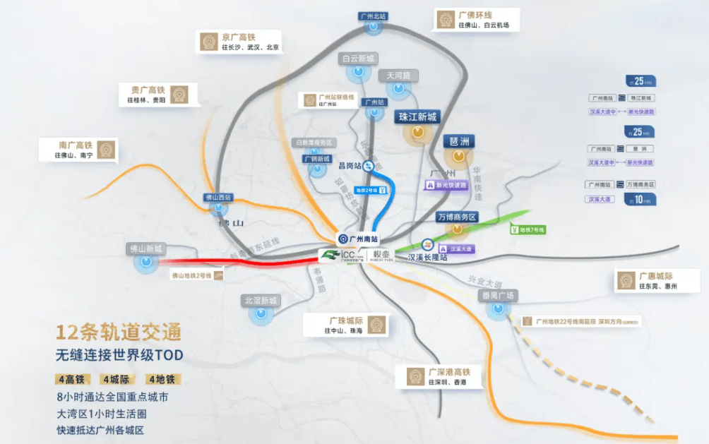 首先,项目的区位优势得天独厚,坐落于番禺区南站核心区,紧邻广州南站东广场仅约400米,步行5分钟就能抵达广州南站——要知道,广州南站是全国客流量最大的铁路交通枢纽,更是大湾区互联互通的核心节点,从这里出发,轻松串联起大湾区各个城市,线小时生活圈”。