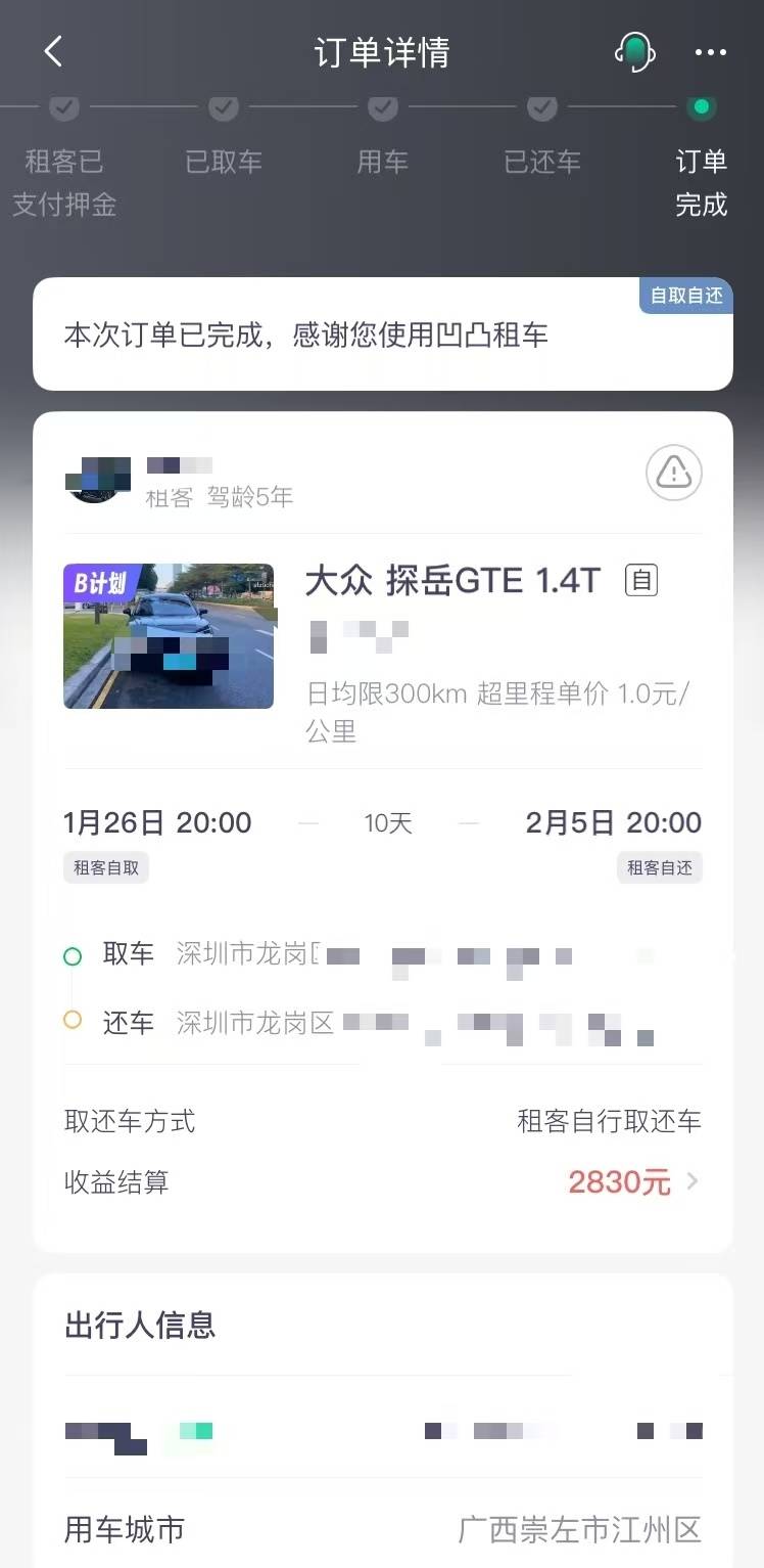 2025年1月26日,张先生又接到一个订单,他与租客约定的取车地点在深圳市龙岗区,租客将车辆开到广西崇左使用,租期为10天。订单详情显示,本次收益结算为2830元,张先生介绍,加上平台返点,该订单收益为3200元,至今未提现成功。