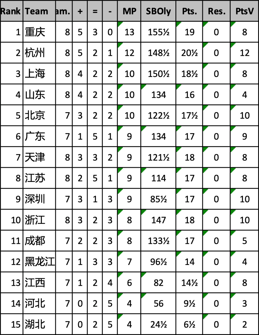重庆队本轮对阵黑龙江队,展现出强大的整体实力。前两台卜祥志、肖同分别与王一业、侯羿帆弈和,但第三台刘言和第四台曹庆锋双双告捷,分别战胜范会丰和曲彦桥,帮助重庆队以3比1全取2分。重庆队八轮过后5胜3平保持不败,以13分独占鳌头。