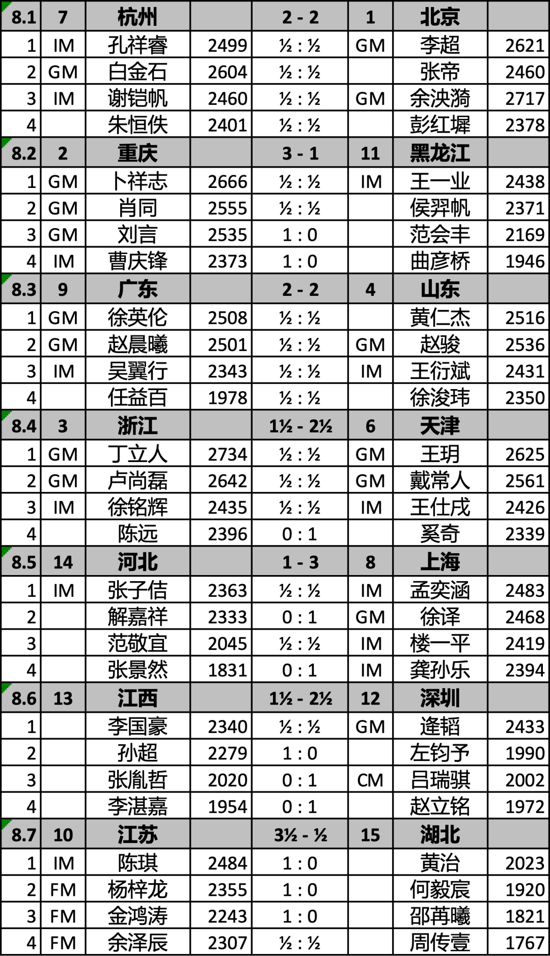 杭州队与北京队本轮上演强强对线分同样处于前列。四台对局全部以和棋告终——孔祥睿对李超、白金石对张帝、谢铠帆对余泱漪、朱恒佚对彭红墀,各取1分。