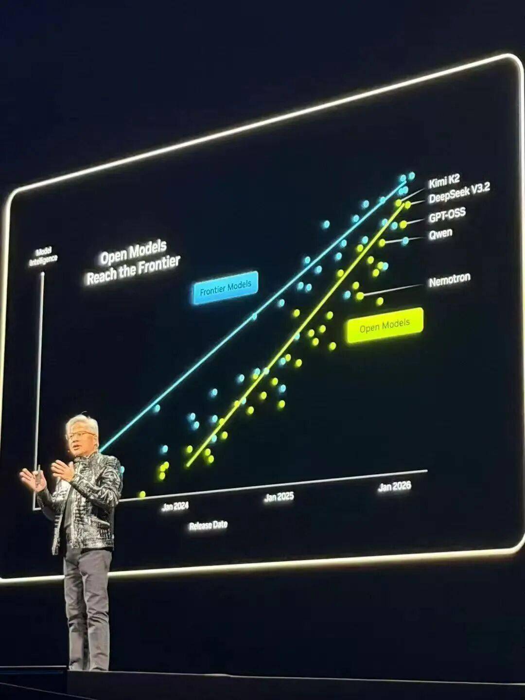 老黄展示了一张「开源模型逼近闭源前沿」的图,被点名的是:Kimi K2、DeepSeek V3.2、Qwen。